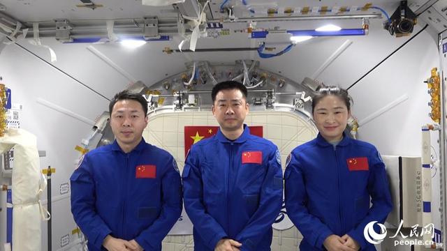 神舟十四号航天员乘组陈冬、刘洋、蔡旭哲。来源:视频连线截图