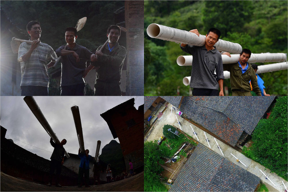 拼版照片:融安县东起乡铜板屯村民修建人畜饮水工程的场景。上左:铜板屯村民在修建人畜饮水工程(2017年3月5日新华社记者张爱林摄);上右:村民龙革雄(左)和龙飞联搬运排污管道(2017年8月15日摄);下左:铜板屯村民们在搬运排污管道(2017年8月15日摄);下右:铜板屯村民们在搬运排污管道(2017年8月15日摄)。