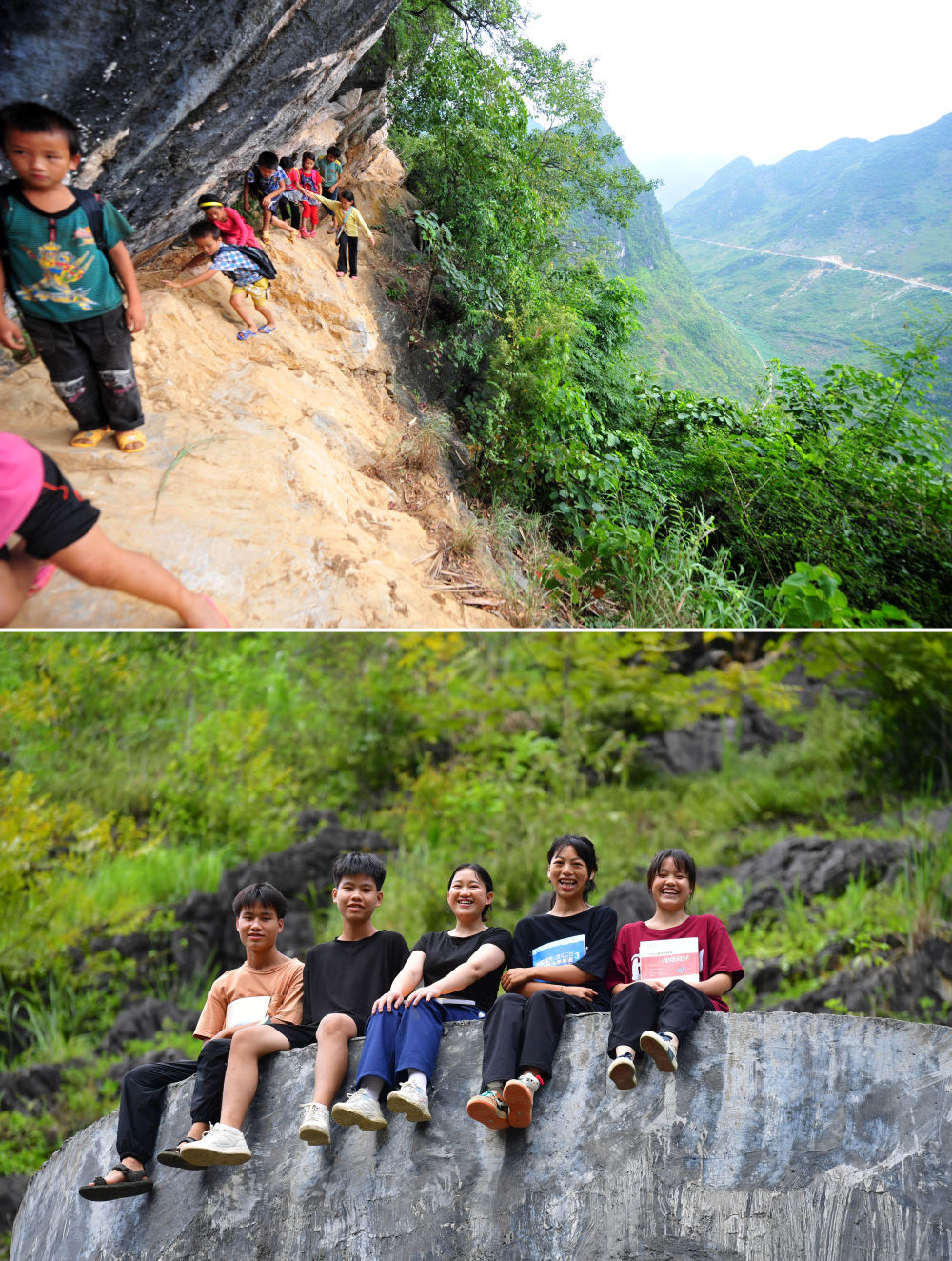拼版照片上图:在广西大化瑶族自治县板升乡弄雷村哈保屯,11岁的蒙秋艳(右一)在悬崖边护着低年级的小伙伴回家(2012年9月3日摄);下图:已经是广西医科大学大二学生的蒙秋艳(中)和小伙伴们在家门口合影(2022年8月23日摄)。
