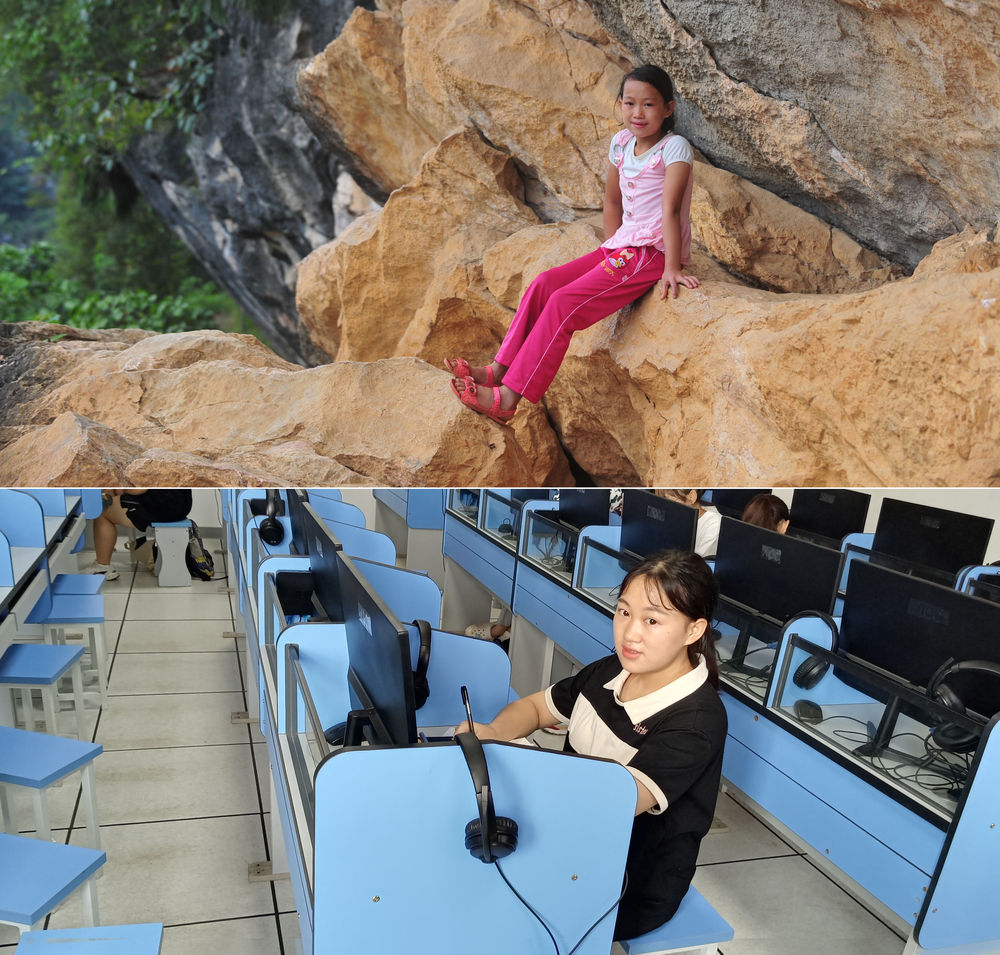 拼版照片上图:在广西大化瑶族自治县板升乡弄雷村哈保屯,11岁的蒙秋艳在悬崖边休息,这一处约300米长的半山悬崖,是她读小学期间每天都要走的路(2012年9月5日摄);下图:已经实现大学梦想的蒙秋艳,就读于广西医科大学,这是她在学校的语音室学习(2022年9月5日韦婷婷摄)。