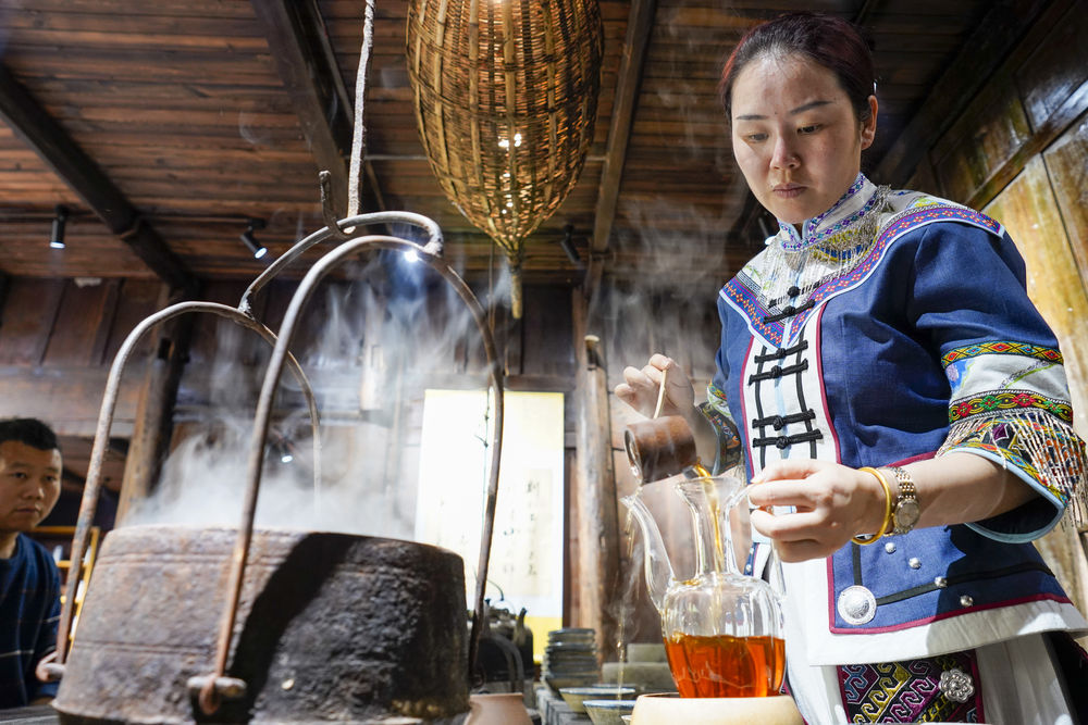 2021年5月13日,在重庆市石柱县中益乡的老鹰茶工作室内,茶艺师在为前来选购茶叶的游客烹煮老鹰茶。新华社记者刘潺摄