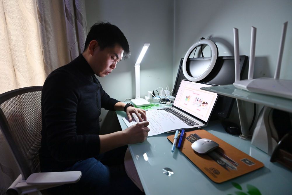 11月30日,太原市交通学校老师韩锐在家里整理线上心理课程教案。新华社记者 杨晨光 摄