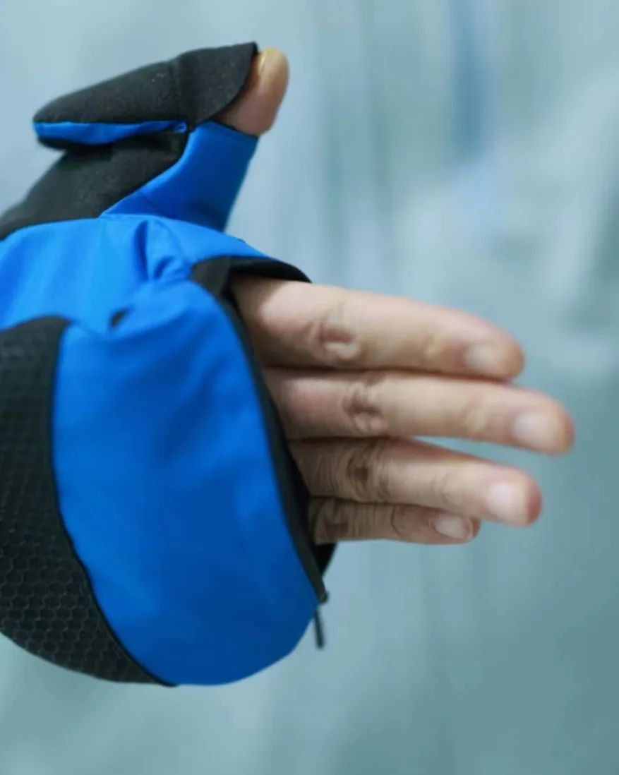 2、当需要完成手部操作时,可通过将拉开掌指关节和拇指关节处拉链,将指端手套部分向后折叠,通过魔术贴固定于手背处,从而使手指全部暴露进行精细化操作动作,也可随时将手指回缩至手套内取暖;
