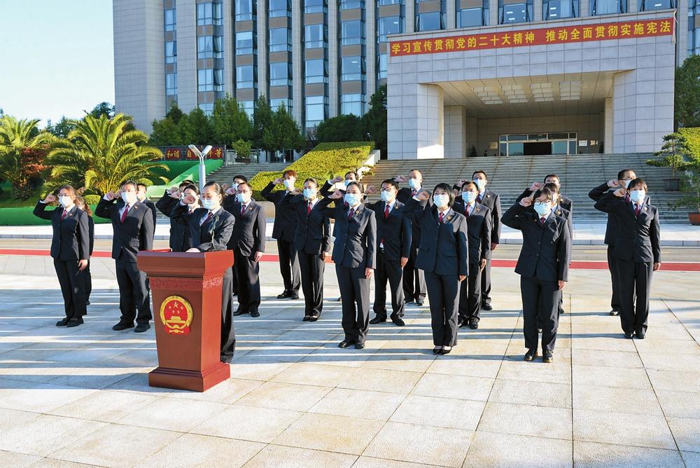 “我宣誓:忠于中华人民共和国宪法,维护宪法权威,履行法定职责……”12月2日,省人民检察院举行宪法宣誓仪式,省检察院机关、昆明铁路运输检察分院新提拔任用处级领导干部和新进人员,面向国旗,举起右拳,庄严宣誓,用铿锵誓言表达对宪法法律的敬畏之心和维护公平正义的决心。