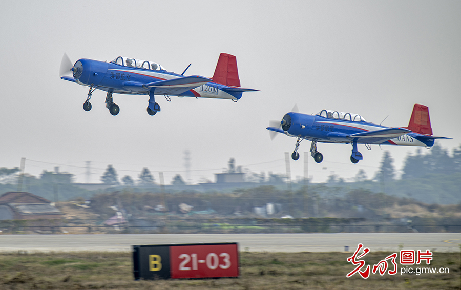红星飞行表演队双机编队入场表演。(蒋聚荣摄/光明图片)