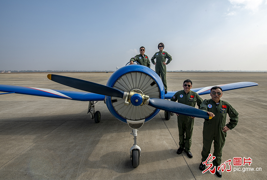 这是飞行表演结束后,部分队员在洪都三代教练机(初教6、教8、教10)的画作前接受检阅并合影。(蒋聚荣摄/光明图片)