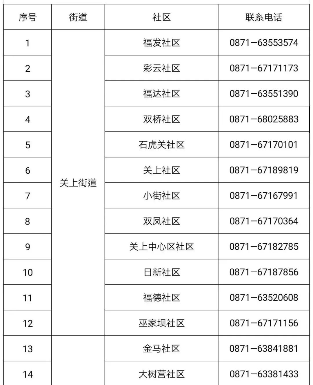 联盟街道 | 葵花 社区 | 0871-65619912 | 18008801175 | 08:00 -20:00 | |