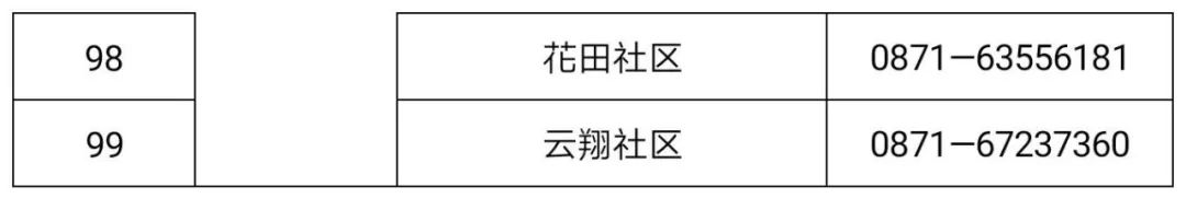 东华街道 | 田园路社区 | 0871-67163631 | 18082984867 | 08:00 -20:00 | |