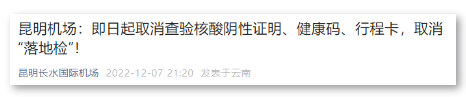 12月7日,据昆明长水国际机场消息,即日起,昆明机场取消查验进出港旅客的核酸阴性证明、健康码、行程卡,进港旅客不再进行落地核酸检测。具体内容如下: