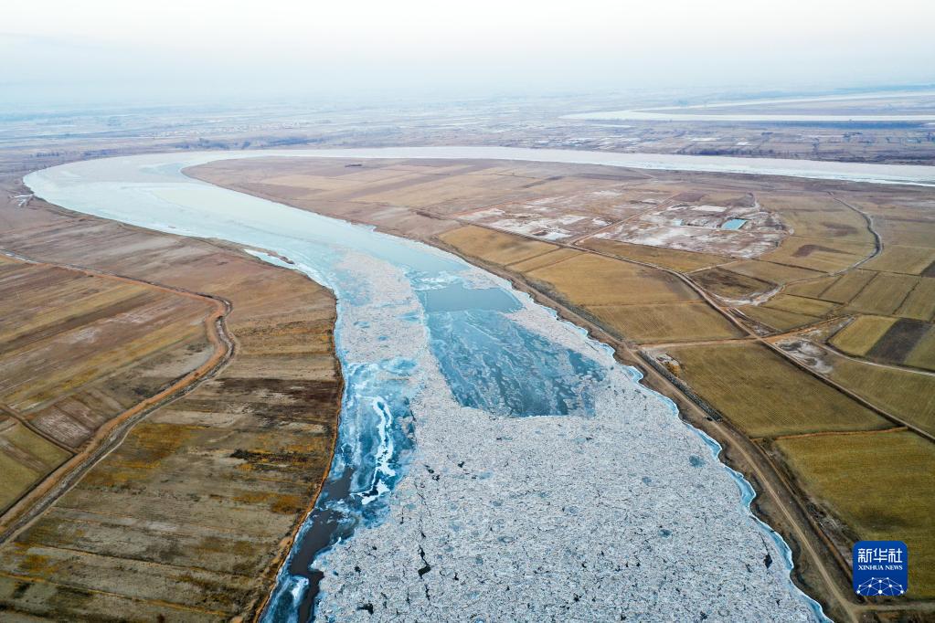 12月7日拍摄的内蒙古鄂尔多斯市达拉特旗冰封黄河景象(无人机照片)。