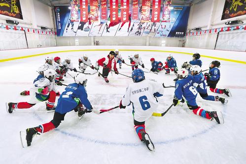 冰球小将们在张家口市经开区“冰之梦”滑冰场训练。