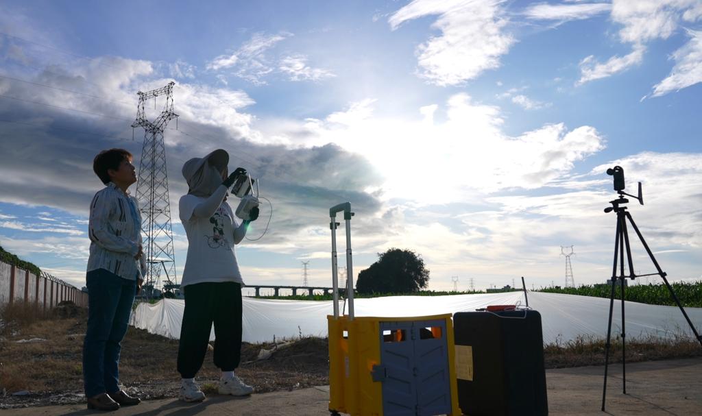 刘云玲(左)和团队成员通过无人机采集作物信息。新华社记者王军锋摄