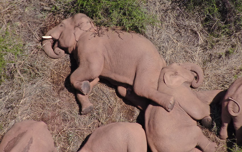 2021年6月9日10时24分,北上南归象群在云南省玉溪市易门县扒河附近睡觉。云南省森林消防总队供图