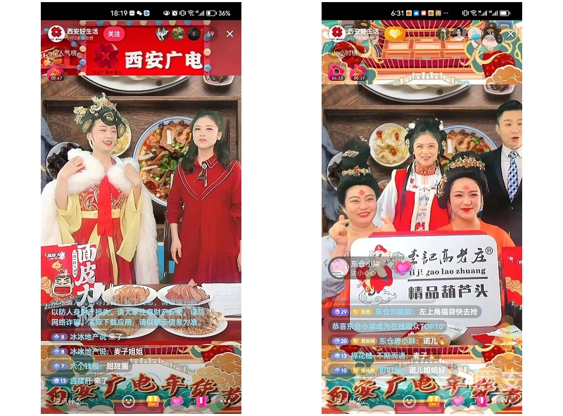 “西安曾因为一个人,一次次冲上城市热搜榜,从此,西安梦在更多人的心中落地生根,也成了各地游客来西安游玩的理由。”还记得那位眼神专注妩媚,姿态优雅又撩人,一下子就让人有种“梦回大唐”的网络名人“不倒翁”小姐姐皮卡晨吗?还有打卡大唐不夜城,现场吟诗与游客互动对诗送肉夹馍的“李白”吗?还有身着唐代武将盔甲,在石头上露出上半身,表情严肃地用锤子砸錾子的“石头哥”吗?这些西安知名的网络“大咖”纷纷来到“西安好生活直播间”热情助阵,他们身着鲜明的唐代传统服饰,带领消费者穿越历史,感受唐代传统文化的魅力,在虚实交织的场景中感受唐朝经济繁荣的新奇体验,同时,直播间里,网红也与西安广播电视台节目主持人亲密互动,营造起线上年货节热闹、喜庆、祥和的新年氛围,为全国各地的网络消费者营造不一样的新年味道。