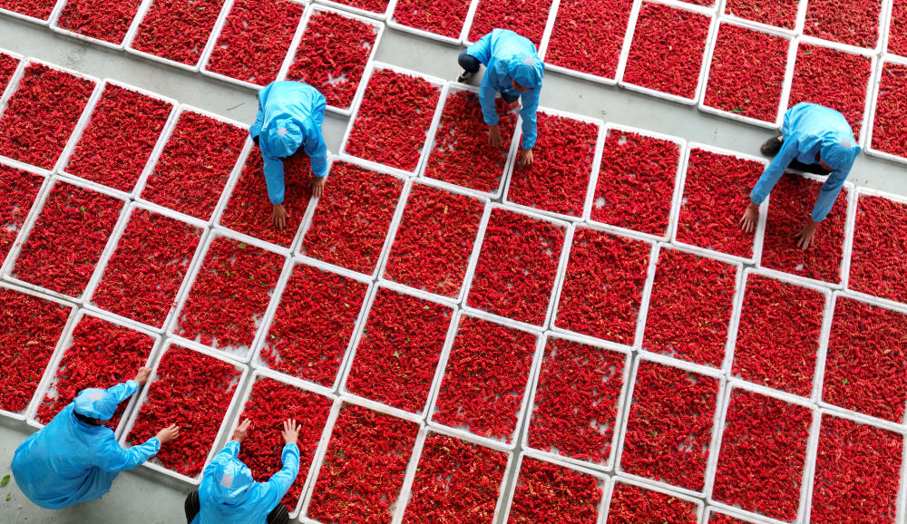 陕西省商洛市洛南县煜正中药材专业合作社的员工在晾晒新采摘的五味子(2022年8月21日摄,无人机照片)。新华社记者 陶明 摄