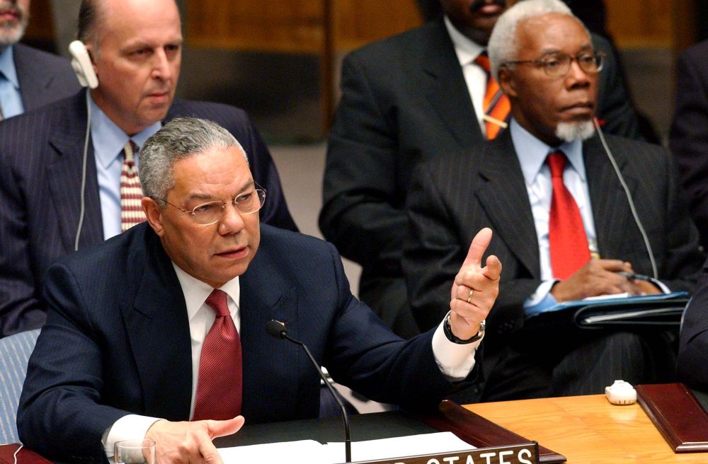 2003年2月5日,时任美国国务卿鲍威尔在联合国安理会会议上拿出一个装有白色粉末的试管,声称是伊拉克正在研制化学武器的证据。同年3月20日,美英联军以此为由发动伊拉克战争。