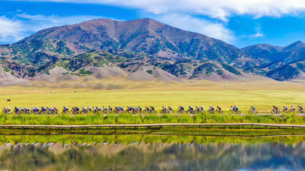 自行车赛选手在新疆赛里木湖国家湿地公园骑行(2022年7月26日摄,无人机照片)。新华社发(于苏甫·艾尼 摄)