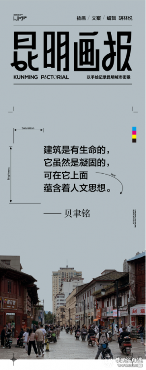 “关于一座城市的想象有许多种,而建筑与街景是其中最为具象的。昆明这方土地滋养着我们,但我们共同身处其中,却鲜有心思为某个建筑或街景驻足观赏,它们不仅有因为一方独特文化而造就的独有构筑形式,更在砖与石的外壳下承载着关于这个地方的文化与人们的故事。让更多本地人看看昆明,让更多外地人看见昆明。”是胡林悦开启《昆明画报》这个手绘计划的初衷。
