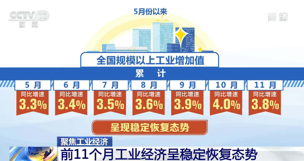央视网消息:工业是经济增长的主体和引擎,振作工业经济是稳住经济大盘的坚实支撑。最新数据显示,今年前11个月,全国规模以上工业增加值同比增长3.8%。自5月份以来,同比增速持续提升,呈现稳定恢复态势,有力支撑了国民经济平稳运行。