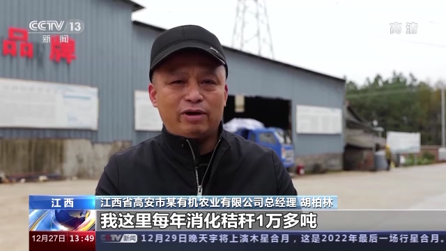 江西省高安市某有机农业有限公司总经理 胡柏林:我这里每年消化秸秆1万多吨,用来做有机肥发酵。肥料现在出货量每天是十来车,将近达到200多吨(每天)。