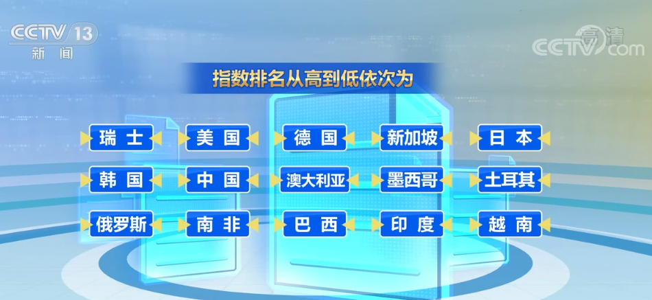 报告显示,指数排名从高到低依次为瑞士、美国、德国、新加坡、日本、韩国、中国、澳大利亚、墨西哥、土耳其、俄罗斯、南非、巴西、印度、越南。