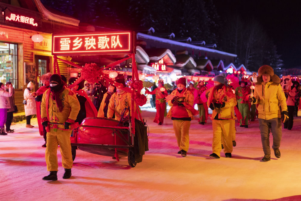 12月14日,秧歌队在雪乡景区内表演。新华社记者 谢剑飞 摄