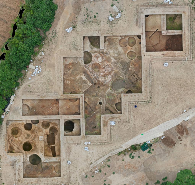 新发现的墓葬区位于遗址外壕沟东侧,是一处大型成人墓葬区,经初步勘探,墓葬区面积约15000平方米,墓葬分布较为密集,目前已勘探发现300余座墓葬,均为长方形竖穴土坑墓,方向大都是东西向,呈现一定的分布规律。