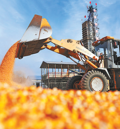 黑龙江北大荒农垦集团赵光农场,铲车在晒场倾倒玉米。新华社记者 王建威摄