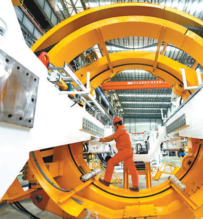 浙江中铁装备盾构机生产基地,工人在安装新型盾构机的部件。龙巍摄(新华社发)