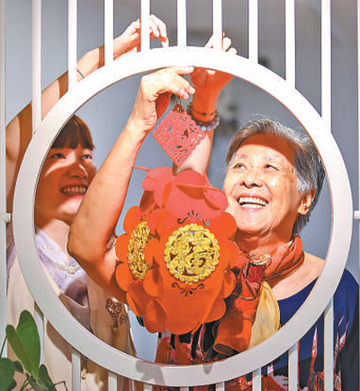 福建福州鼓楼区安泰街道,老人和社区工作者一起悬挂花灯。谢贵明摄(影像中国)