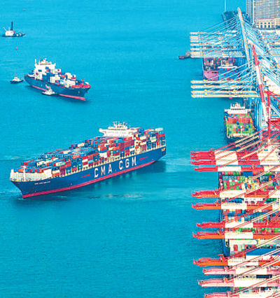 山东港口集团青岛港前湾集装箱码头船来船往,装卸繁忙。韩加君摄(影像中国)