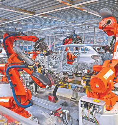 华晨宝马沈阳铁西工厂车身车间,机械臂在焊接车身。新华社记者 杨 青摄