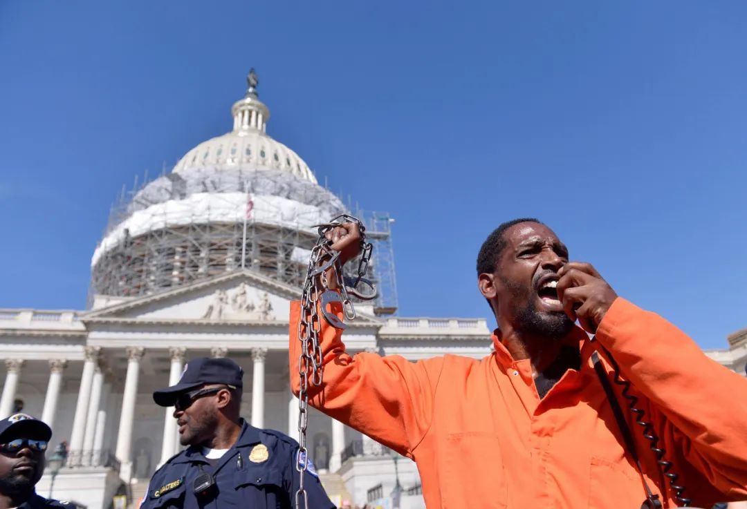 ▲ 2016年4月,美国华盛顿特区国会山,一名抗议者高喊反对金钱政治口号。
