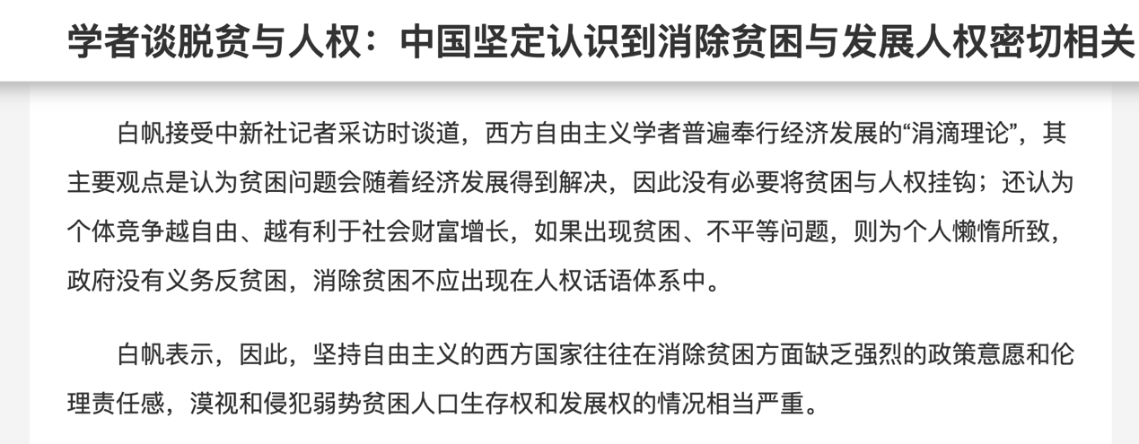中国社会科学院中国边疆研究所副研究白帆认为,讲中国人权先谈消除贫困,是因为中国把生存权、发展权作为首要的基本人权。这其实折射了在对贫困与人权之关系的认识上,国际社会尚存在较大的认知鸿沟,而这也是某些西方国家政客、智库等对中国消除贫困政策存在偏见的原因之一。白帆表示,坚持自由主义的西方国家往往在消除贫困方面缺乏强烈的政策意愿和伦理责任感,漠视和侵犯弱势贫困人口生存权和发展权的情况相当严重,中国共产党和中国政府坚定地认识到消除贫困与发展人权密切相关,中国的人权观吸收了马克思主义反贫困思想,同时,中国将消除贫困视为人权重要内容,也源于中国传统伦理价值观。该片展现中国脱贫攻坚战取得全面的胜利,让每一个中国公民都享有前所未有的尊严和权利,这是中国人民的伟大光荣,也是中国对世界人权事业发展做出的重要贡献。