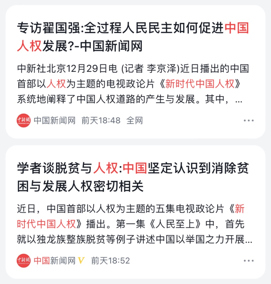 电视政论片《新时代中国人权》的热播正值2022年岁末年终,中国人权事业发展也成为新闻媒体盘点总结的重要角度。中新网围绕政论片涉及的脱贫、民主等议题进行专题报道,结合电视片中的故事采访专家进行专门论述,发布评论文章《专访翟国强:全过程人民民主如何促进中国人权发展?》《学者谈脱贫与人权:中国坚定认识到消除贫困与发展人权密切相关》等,在学界和媒体界将对该片的讨论引向深入。
