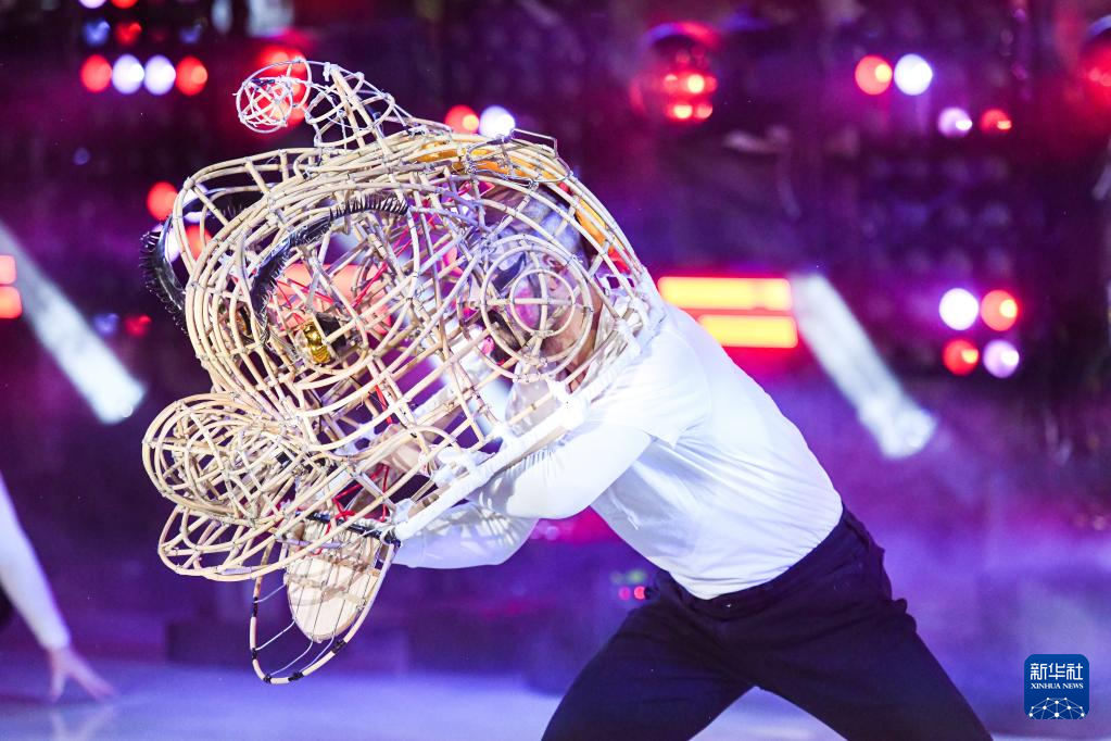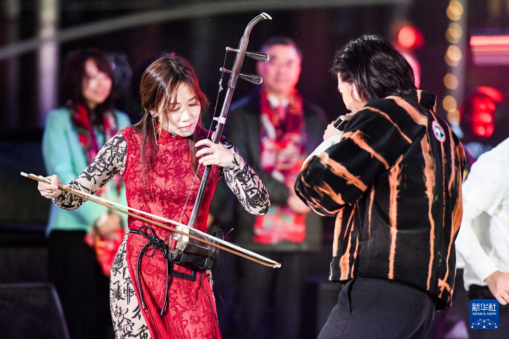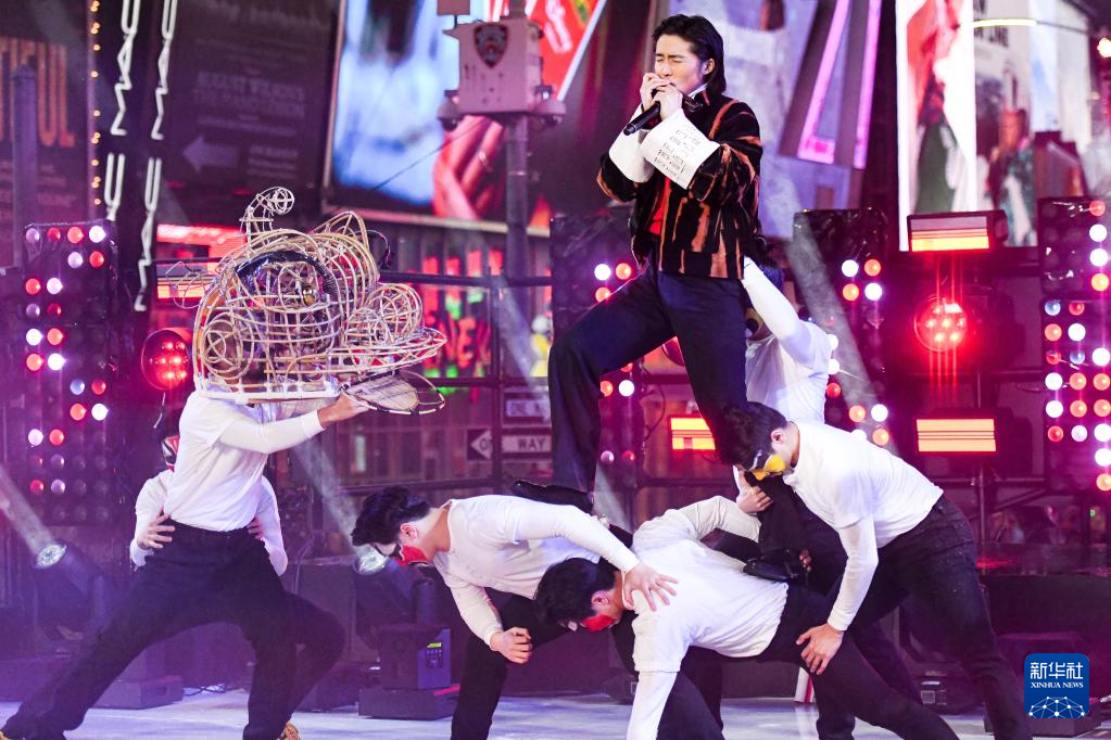 2022年12月31日,在美国纽约时报广场,来自中国香港的艺术家在跨年倒计时活动上表演。新华社发(朱子于摄)