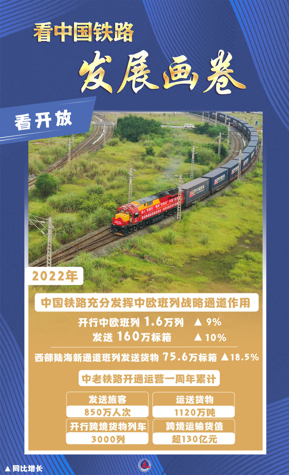 2022年,中国铁路充分发挥中欧班列战略通道作用,开行中欧班列1.6万列、发送160万标箱,同比分别增长9%、10%;西部陆海新通道班列发送货物75.6万标箱,同比增长18.5%。中老铁路开通运营一周年累计发送旅客850万人次,运送货物1120万吨,开行跨境货物列车3000列,跨境运输货值超130亿元。