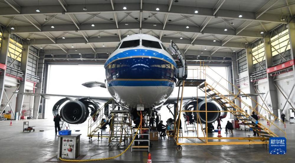 1月5日,在位于海南省海口市的中国南方航空美兰基地机库,工程师在对飞机进行检修。新华社记者 杨冠宇 摄