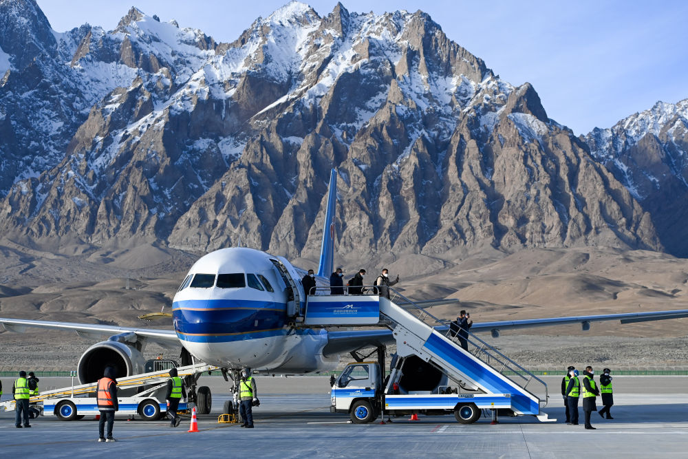 2022年12月23日,巍巍帕米尔高原上,中国最西端的运输机场——新疆塔什库尔干红其拉甫机场正式通航,冰山上迎来首批“空中来客”,这是乘坐首航航班的旅客走下飞机。新华社记者丁磊 摄