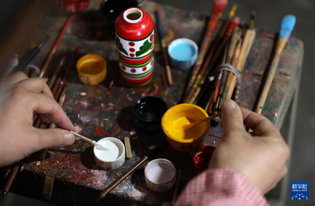 1月8日,山东省临沂市郯城县港上镇樊埝后村村民在给木旋玩具上色。新华社发(张春雷/摄)