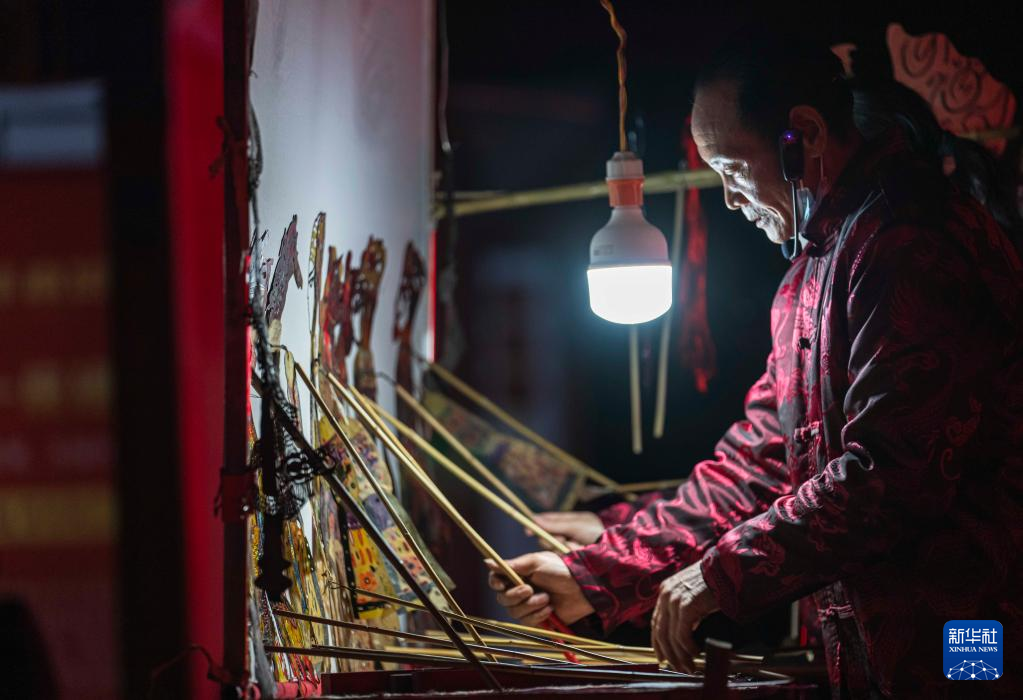 1月10日,在湖北省恩施土家族苗族自治州鹤峰县城,艺人在表演非遗皮影戏。新华社发(覃涛/摄)