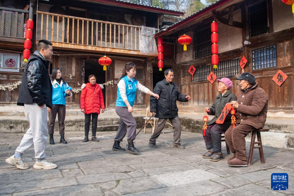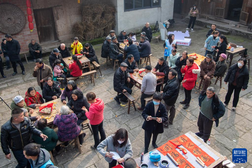 1月11日,重庆市綦江区三角镇中坝村在村中有百年历史的“廖家大院”举行“山村喜事多”活动,村民围坐在一起话家常、畅想新年目标,热热闹闹迎新春。