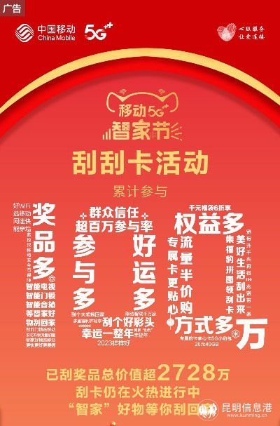 每到年底,云南移动都开展刮刮卡客户回馈活动。此次刮刮卡活动时间将持续至2023年2月28日。在此期间,云南移动用户可在全省各大移动网点参与活动。