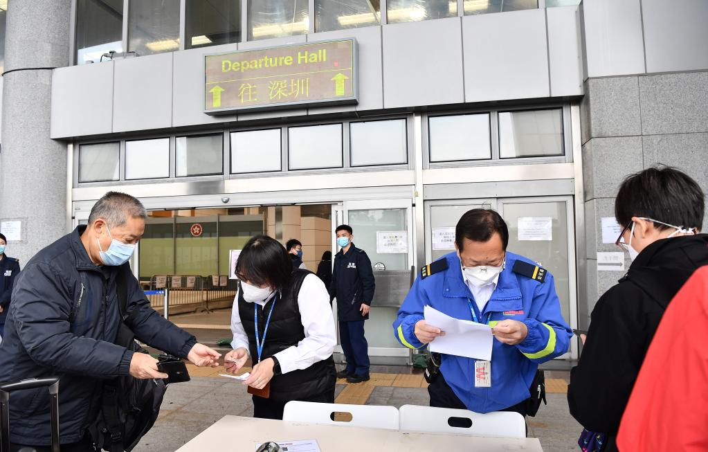 1月8日,香港工作人员在深圳湾口岸查验旅客过关手续资料。新华社记者 陈铎/摄