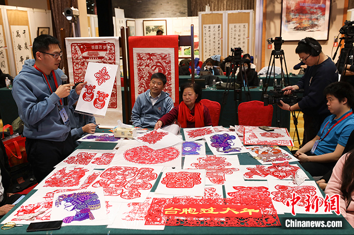 年逾70岁的剪纸达人周慧岩,在北京会场展示她带来的剪纸作品:“这是貂蝉,这是穆桂英;这是来自黑龙江的非物质文化遗产海伦剪纸,这是象征新春吉祥的兔年团花。”