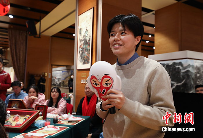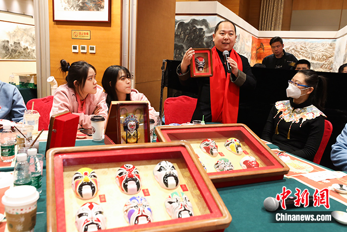图为北京彩塑京剧脸谱制作技艺第五代传承人林泓魁向台湾青年传授脸谱画法。中新社记者 赵隽/摄
