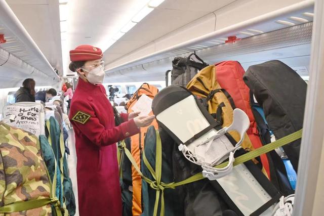 京张高铁D6715次列车上,列车长正在检查滑雪用具的固定情况。(受访者供图)