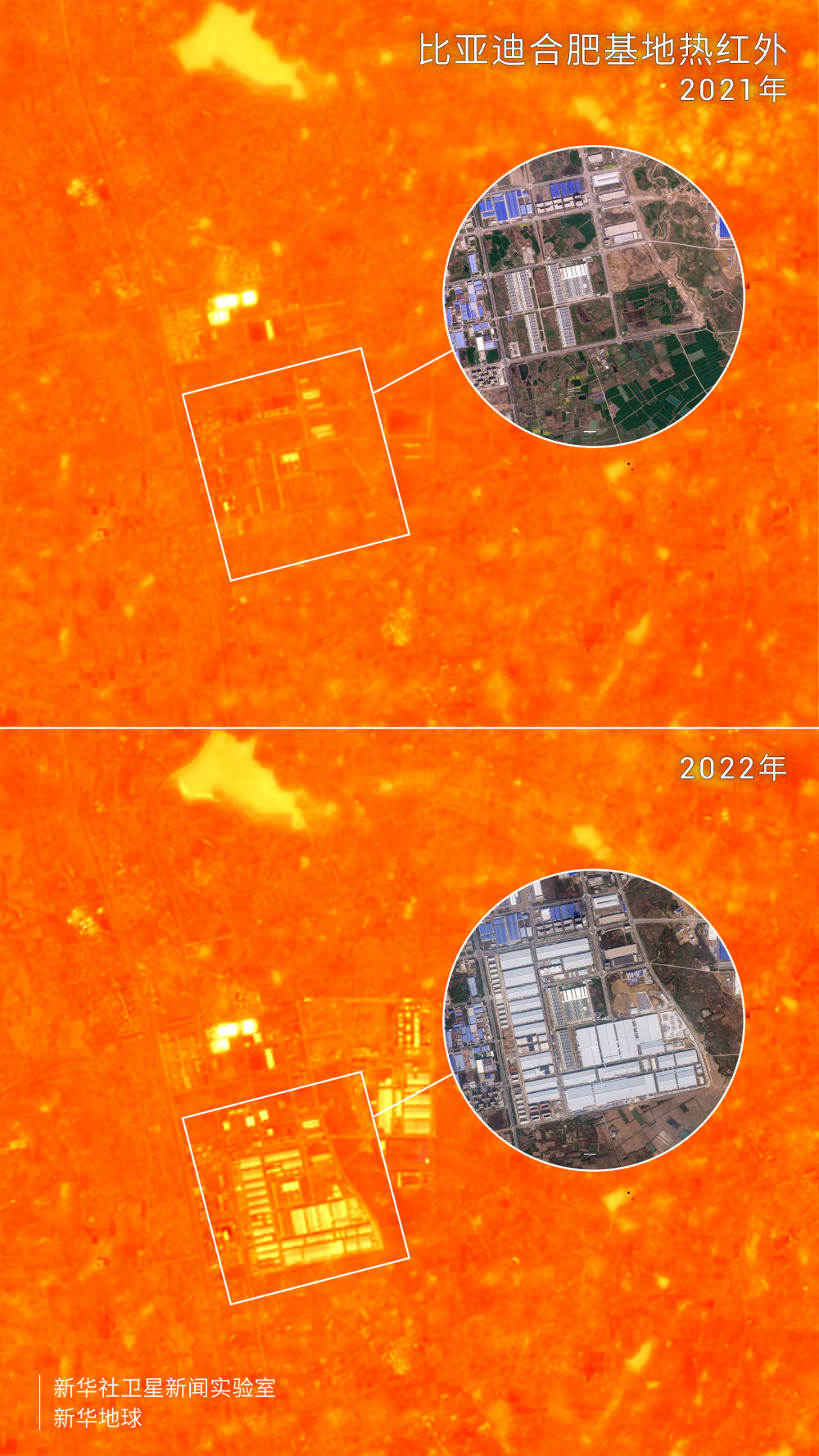 这是遥感卫星拍摄的2021年和2022年比亚迪合肥基地的热红外影像对比图。