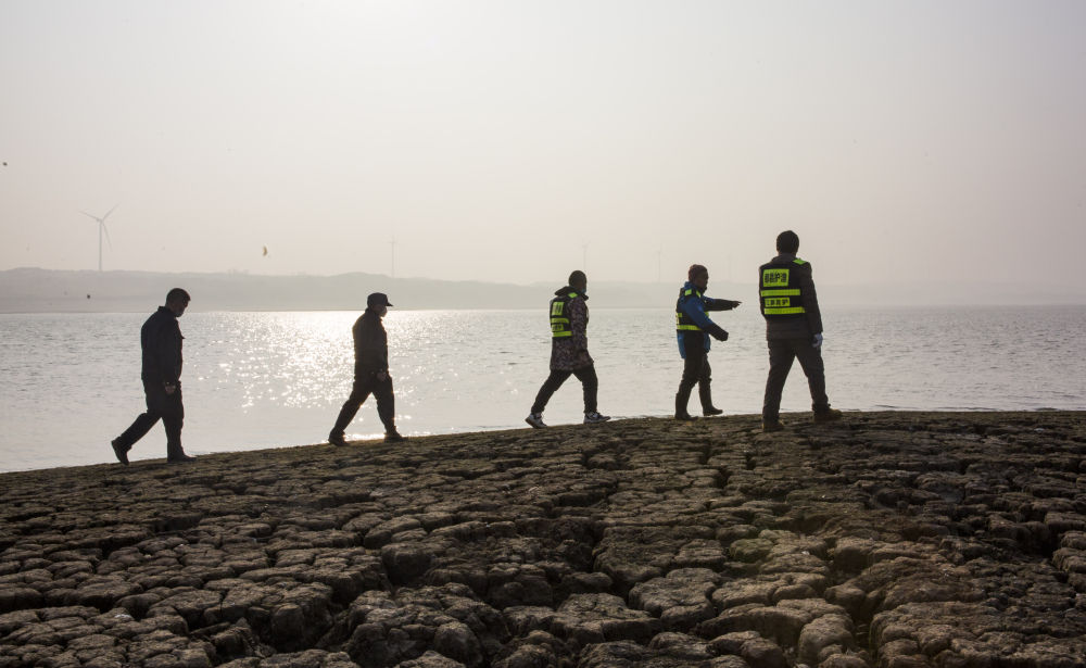 占柏山(右二)和都昌县渔政执法大队执法人员沿着龟裂的沙洲徒步巡查。新华社记者余刚 摄