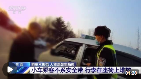 近日,陕西渭南高速交警在京昆高速韩城服务区例行检查时,发现一辆面包车后面两排座椅上的四名乘客都没有系安全带,旁边堆放着大包小包的行李。